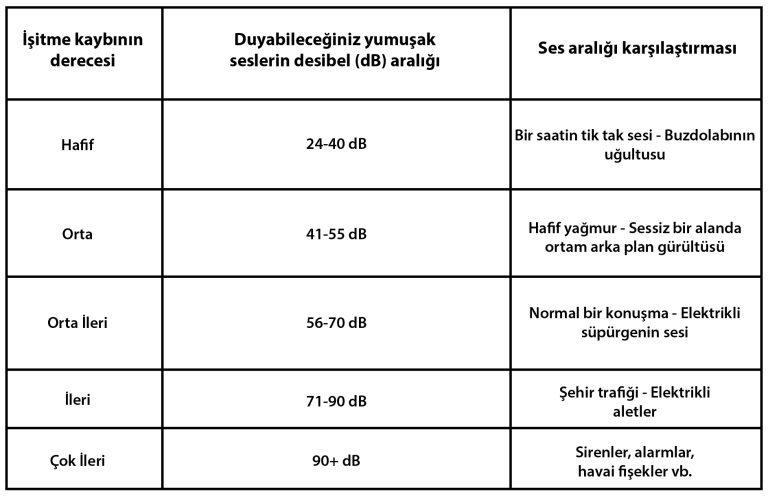 Aşağıdaki tabloda, işitme kaybının farklı dereceleri ve bir kişinin duyabileceği en yumuşak seslere karşılık gelen desibel aralıkları gösterilmektedir: