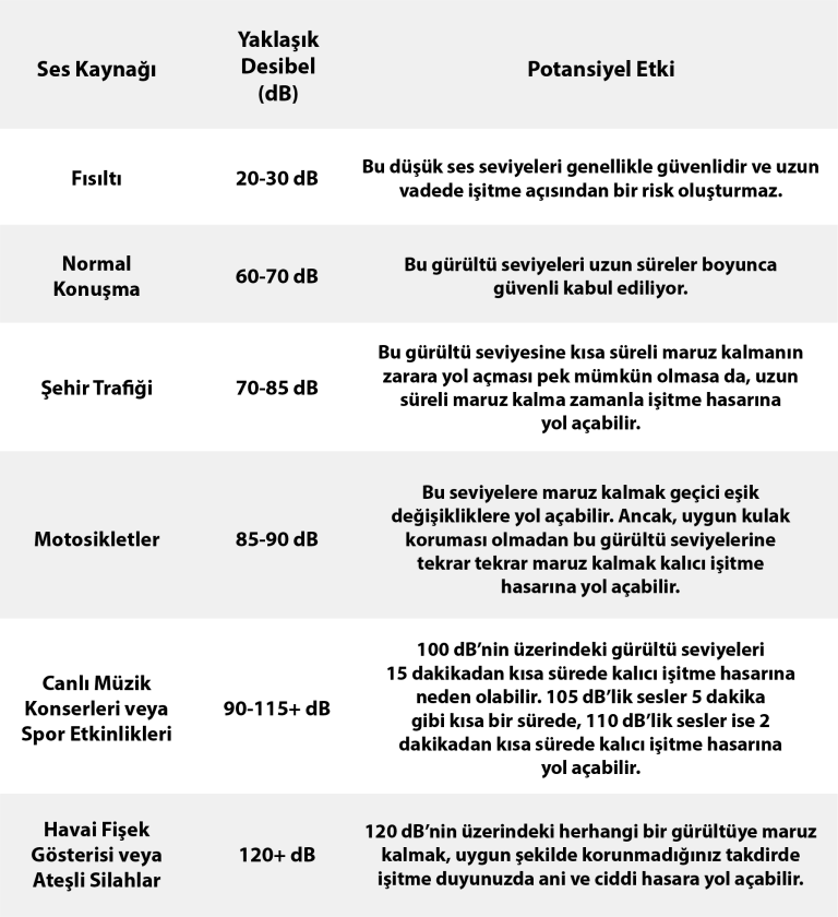 İç kulağınızdaki hassas tüy hücreleri tekrar tekrar hasar görüp yenilenemediğinde, TTS geçici işitme hasarından gürültüye bağlı işitme kaybına dönüşür. Farklı desibel seviyelerinin işitmenizi zaman içinde nasıl etkileyebileceğini anlamak, GBİK’in potansiyel risklerini fark etmek için çok önemlidir. İşte bazı yaygın sesler, tipik desibel (dB) seviyeleri ve zamanla işitmeniz üzerinde yaratabilecekleri kademeli etkiler:
