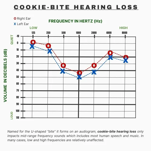 Kurabiye ısırığı tipi işitme kaybı, yalnızca orta frekanslı sesleri etkileyen ve konuşmaları ve diğer birçok günlük sesi anlamak için çok önemli olan nadir bir işitme kaybı türüdür. Kurabiye ısırığı tipi işitme kaybınız olduğundan şüpheleniyorsanız, yardım almak için beklemeyin.