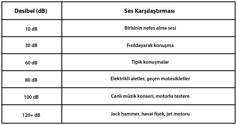 Sağlıklı bir işitme aralığına sahip bir kişi, nefes alma veya fısıltı gibi yumuşak sesleri duyabilir. Aşağıdaki tablo, farklı desibel seviyelerini ve yaygın ses karşılaştırmalarını özetlemektedir: