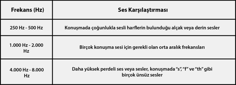 Yüksek frekansları duyma yeteneği genellikle yaşla birlikte azalır ve konuşma netliği önemli ölçüde azalır. Aşağıdaki tablo, farklı frekans aralıklarını, ses aralıklarını ve konuşmayla ilgili yaygın ses karşılaştırmalarını özetlemektedir:
