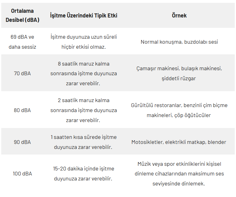 70 desibel üzerindeki gürültüye uzun süre maruz kalmak işitme kaybına neden olabilir.